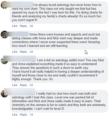 Because we give you the entire program right away we do not offer refunds. The Birth Chart Basics class at the top of this page is a good indicator of Anna's teaching style and our Magic On the Inside podcast episodes are a good indicator of how Sarah Milne speaks to astrology. This playlist will give you an idea as to how Nick MacDonald teaches astrology. Our team of teachers is dedicated to your success and are ready and willing to help!
